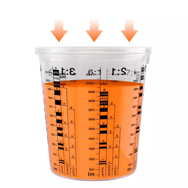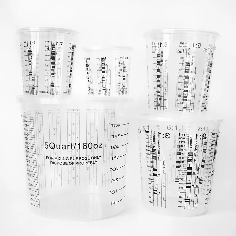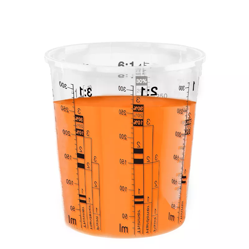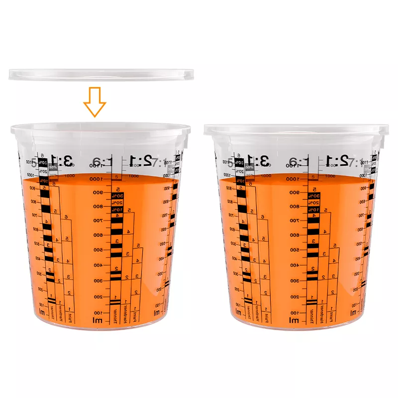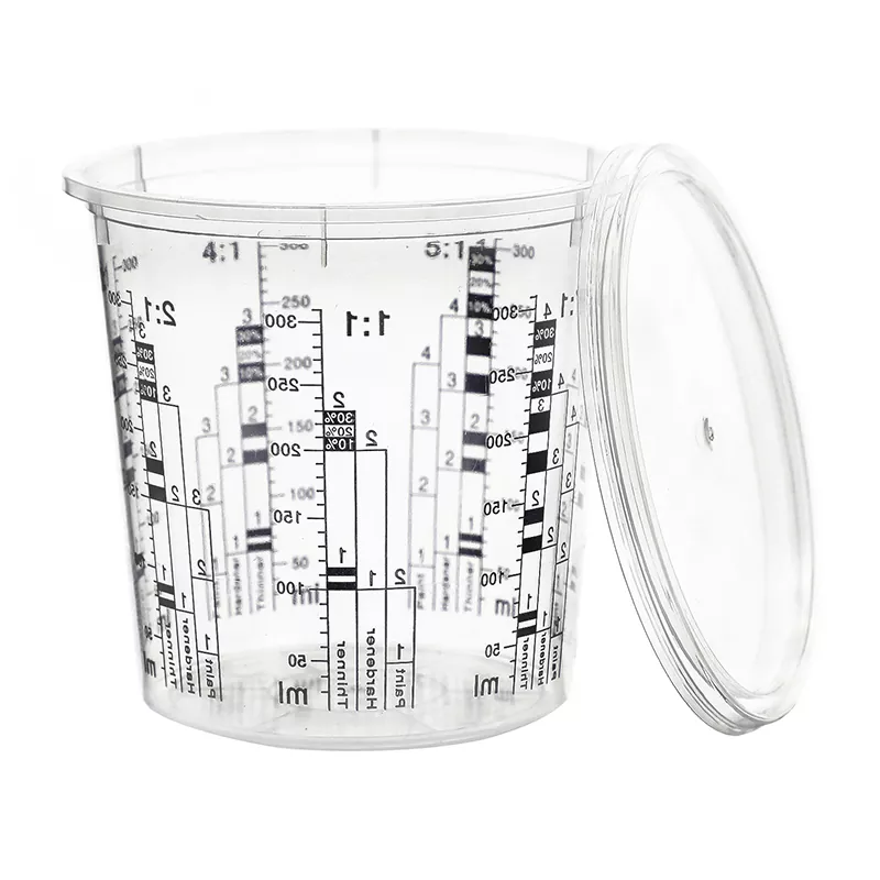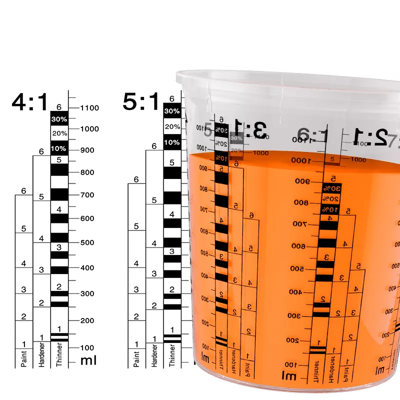 385 ml PP autófestékkeverő pohár fedővel festékkeveréshez és a kevert festék ideiglenes tárolásához. 7 különböző keverési arány, jól nyomtatott és belülről olvasható. Kiváló minőségű festékkeverő pohár fedővel, fedél külön is megvásárolható. Öt kapacitást kínálunk – 385cc, 680cc, 1370cc, 2250cc és 5000cc - minden igényt kielégítve.