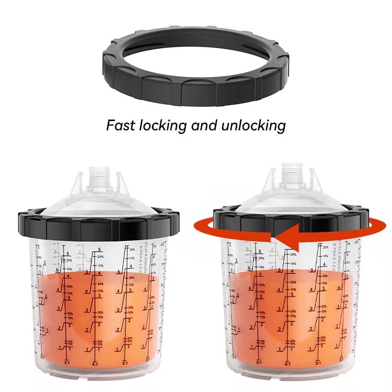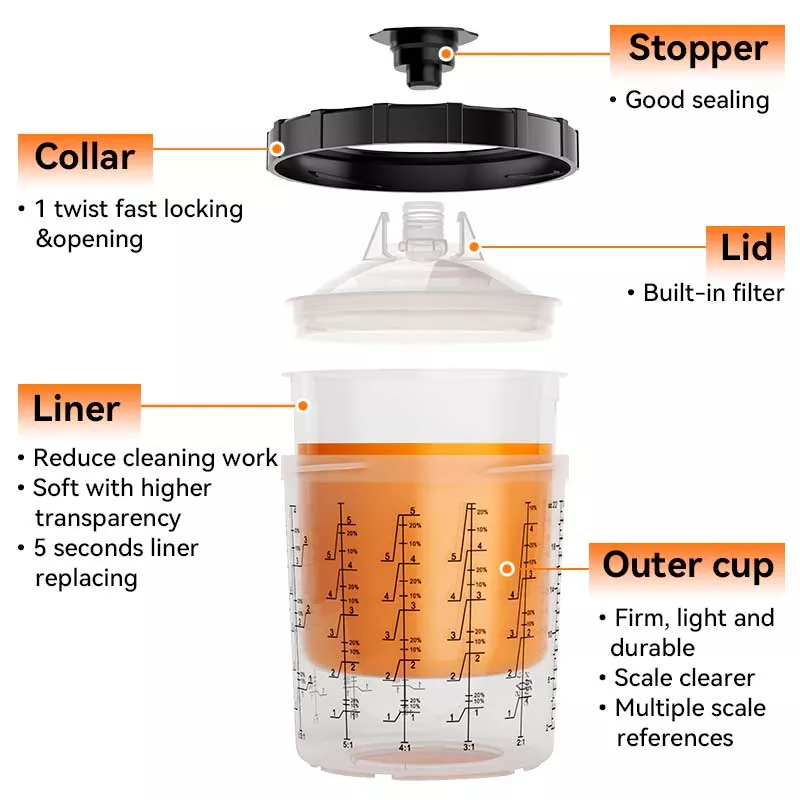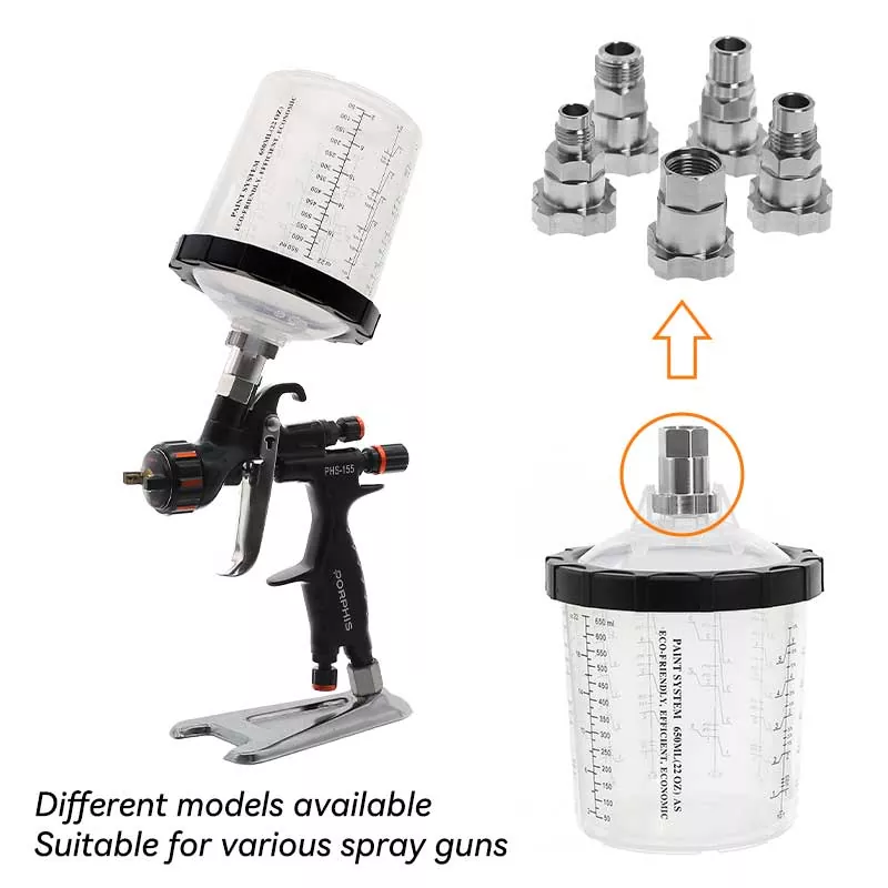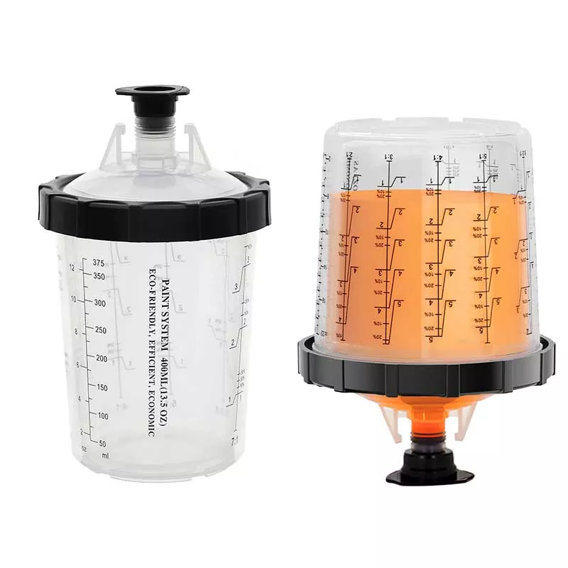Ez a 400 ml-es eldobható festékpohár System 1.0 alapvetően helyettesíti a hagyományos gravitációs adagolópoharat, mert nemcsak több festéket takarít meg, hanem javítja a festés hatékonyságát is. Pontosabban, a bélés automatikus spirális lefelé ívelő kialakítása festéskor teljesen kihasználja a festéket; eközben a gyorsreteszelő plusz béléscsere-kialakítás elkerüli a csésze mosását, lehetővé téve a festési munka hatékony és ismétlődő elvégzését. A piacon szinte minden szórópisztolymárkához rendelkezünk adapterekkel, hogy megfeleljenek a különböző szórópisztoly-rajongók tapasztalati igényeinek. Az adapter rozsdamentes acélból készült, amely ellenáll a festékkorróziónak és nagyon tartós. A bélés és a fedél szoros kombinációja biztosítja, hogy a pohárrendszerből ne szivárogjon festék festés közben, és támogatja a fel nem használt festék hosszú távú tárolását a pazarlás elkerülése érdekében.